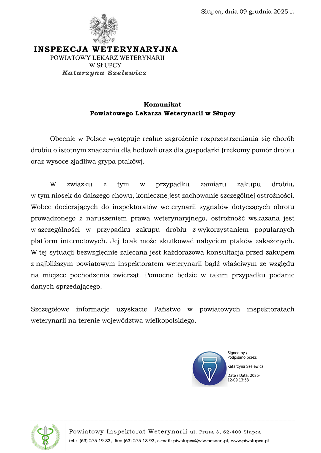Powiatowy Lekarz Weterynarii w Słupcy informuje, iż Rozporządzenie Ministra Rolnictwa i Rozwoju Wsi z dnia 31 marca 2022 r. w sprawie zarządzenia środków związanych z wystąpieniem wysoce zjadliwej grypy ptaków (Dz.U. z 2022 r. poz.768) nakłada na posiadaczy drobiu obowiązek zgłaszania do powiatowego lekarza weterynarii miejsc, w których jest utrzymywany drób lub inne ptaki, z wyłączeniem ptaków utrzymywanych stale w pomieszczeniach mieszkalnych.